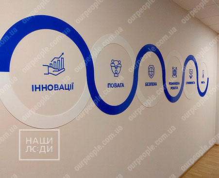 Интерьерные вывески обладают некоторыми преимуществами, по сравнению с объектами наружной рекламы. Интерьерные логотипы и вывески размещаются внутри помещений, где нет угрозы негативного воздействия факторов внешней среды, таких как солнце, ветер, дождь, мороз и перепады температуры. Поэтому можно без риска использовать различные материалы и реализовывать самые неординарные творческие идеи. Особенность интерьерной рекламы в том, что она находится все время на виду и близко от потребителя. Поэтому к ней выдвигаются особые требования. Интерьерные вывески и логотпы должны быть безупречными и качественно выполненными, не зависимо от размера и вида рекламной конструкции. В рекламном бюро «Наши люди» Вы можете заказать логотип на стену в Киеве в любом исполнении с применением различных материалов на выбор, с подсветкой и без нее. Мы предоставим Вам цветовые раскладки материалов для того, чтобы интерьерная вывеска максимально соответствовала фирменному стилю Вашей компании.